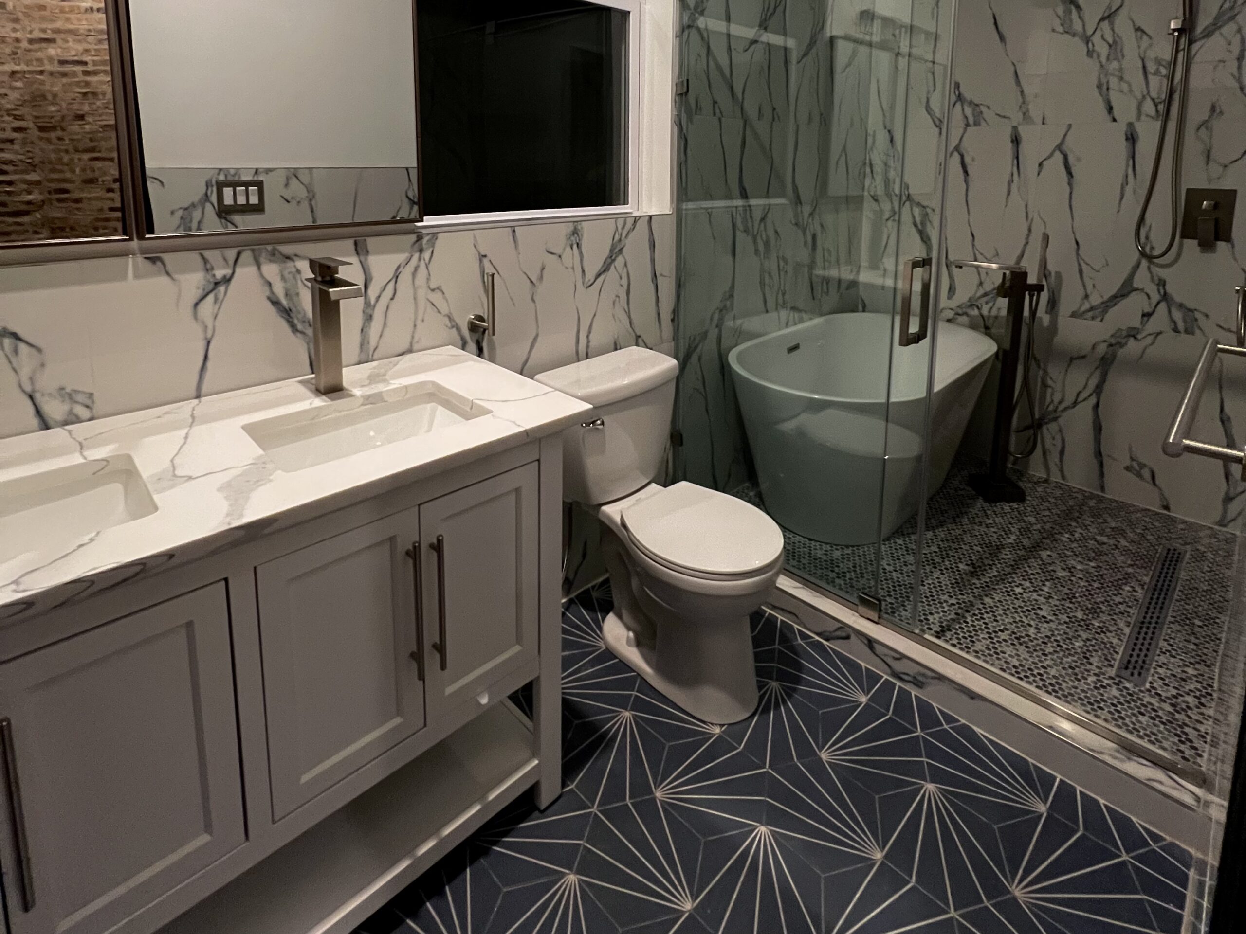 A sleek Chicago residence that blends exposed brick, marble finishes, and modern design. Each room feels refined yet inviting, with a spa-like bath and a kitchen that balances warmth and sophistication.